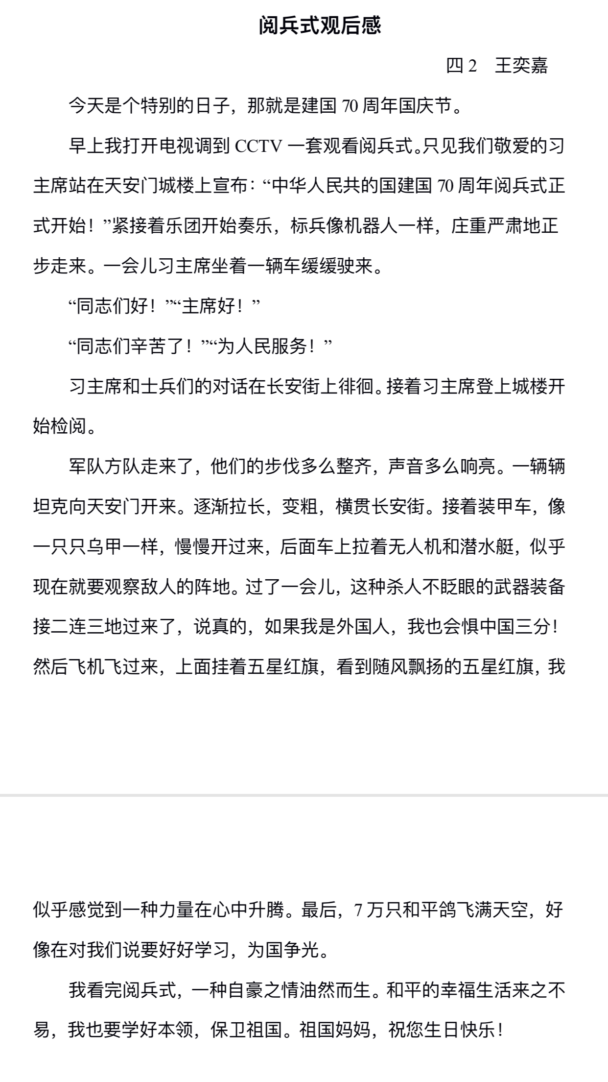 00后們也許對(duì)閱兵式還沒(méi)有那么深刻的理解與體會(huì),但他們?cè)诩议L(zhǎng)的陪同與講解下認(rèn)真觀看國(guó)慶閱兵式,并寫(xiě)下觀后感,寫(xiě)下他們對(duì)祖國(guó)的愛(ài)和祝福。一篇篇稚嫩的文章,無(wú)不在深情的訴說(shuō):“我愛(ài)你中國(guó)”!